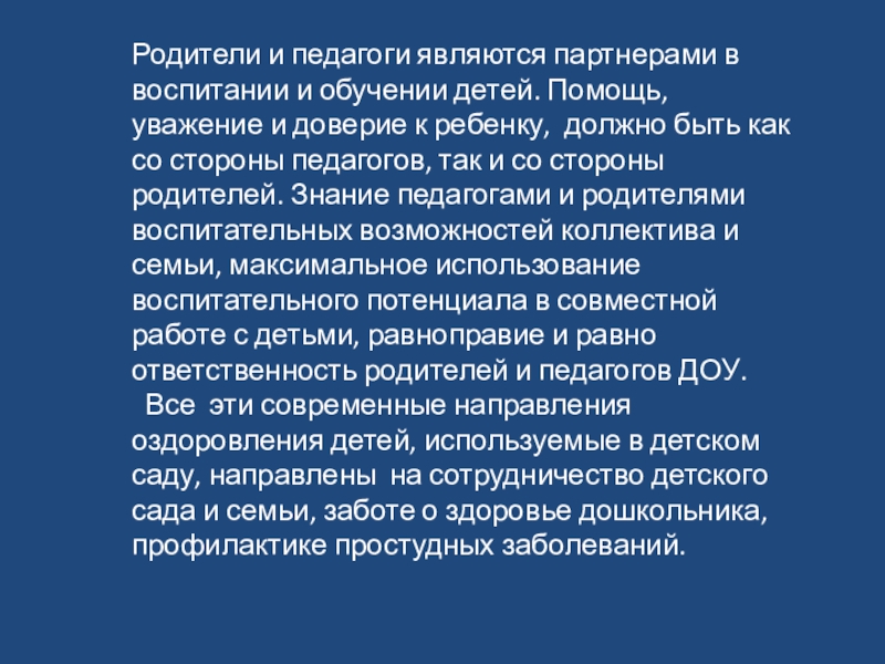 Все эти современные направления оздоровления детей, используемые в детском саду, направлены на сотрудничество детского сада и семьи, заботе о здоровье дошкольника, профилактике простудных заболеваний.