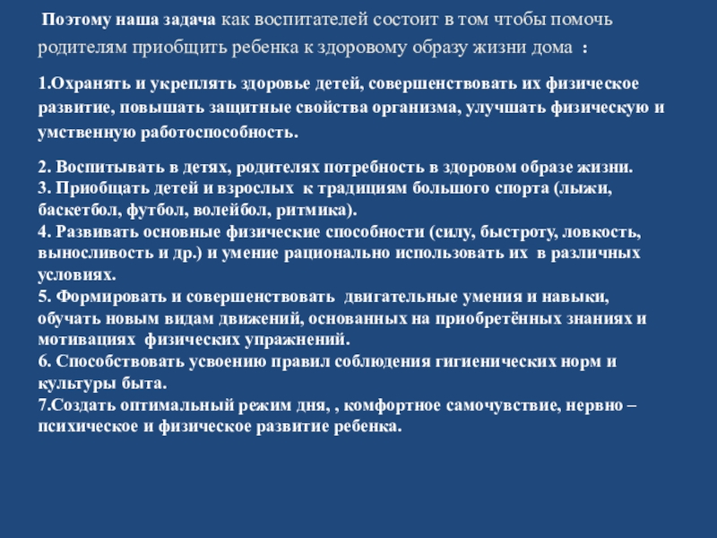 1.Охранять и укреплять здоровье детей, совершенствовать их физическое развитие, повышать защитные свойства организма, улучшать физическую и умственную работоспособность.