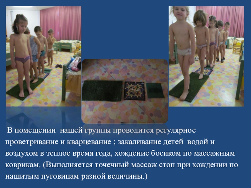 закаливание детей водой и воздухом в теплое время года, хождение босиком по массажным коврикам. (Выполняется точечный массаж стоп при хождении по нашитым пуговицам разной величины.)