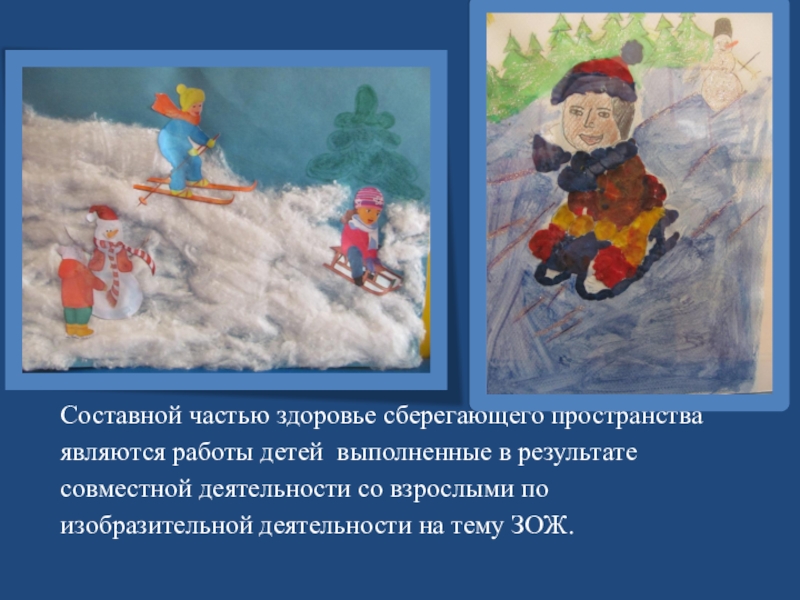 Слайд 13Составной частью здоровье сберегающего пространства являются работы детей выполненные в результате