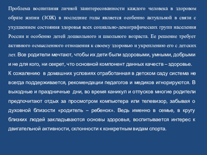 Слайд 2Проблема воспитания личной заинтересованности каждого человека в здоровом образе жизни (ЗОЖ)