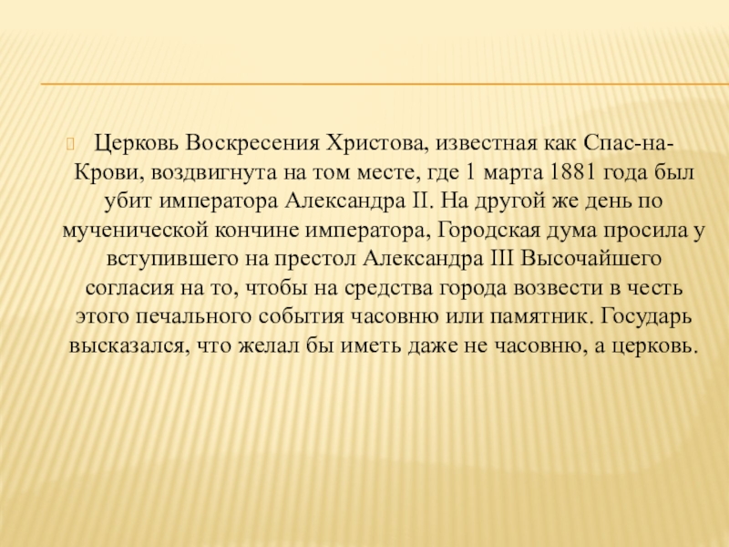 Слайд 27Церковь Воскресения Христова, известная как Спас-на-Крови, воздвигнута на том месте, где
