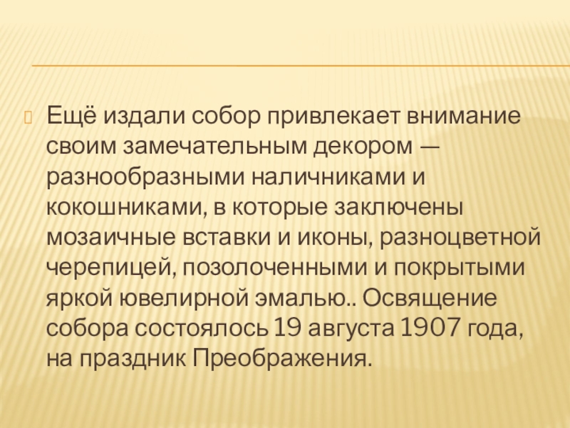 Слайд 29Ещё издали собор привлекает внимание своим замечательным декором — разнообразными наличниками