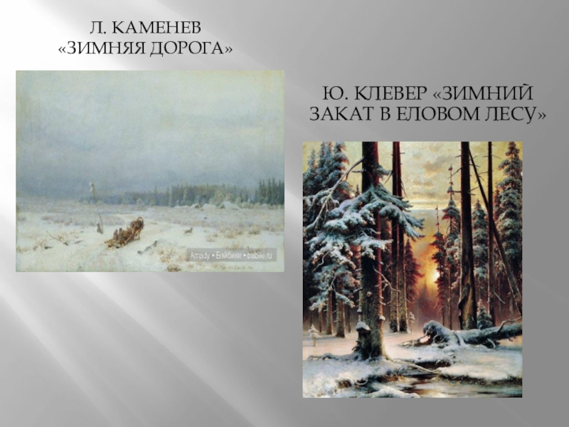 Л. Каменев«Зимняя дорога»Ю. Клевер «Зимний закат в еловом лесу»