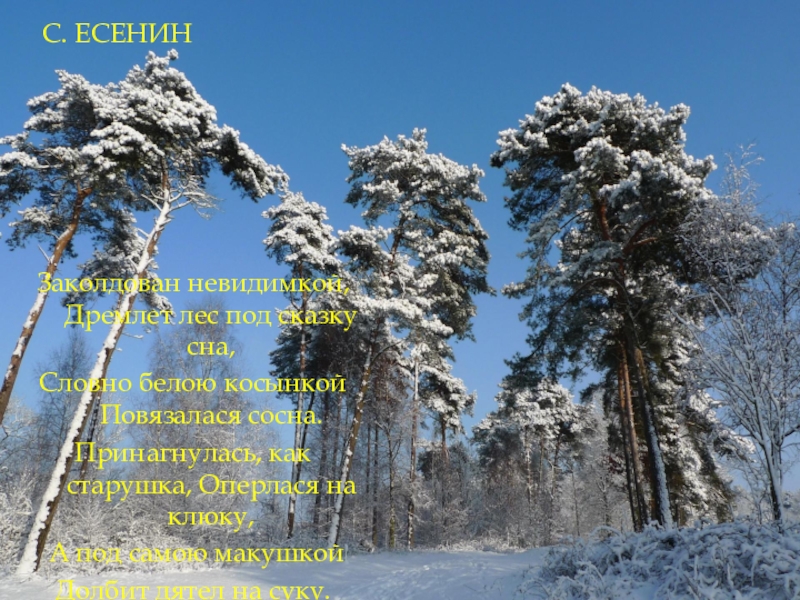 С. ЕсенинЗаколдован невидимкой, Дремлет лес под сказку сна, Словно белою косынкой Повязалася сосна. Принагнулась, как старушка, Оперлася