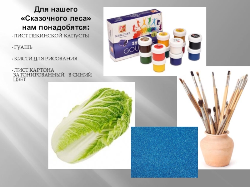 Для нашего «Сказочного леса» нам понадобятся: лист пекинской капусты Гуашь кисти для рисования лист картона затонированный