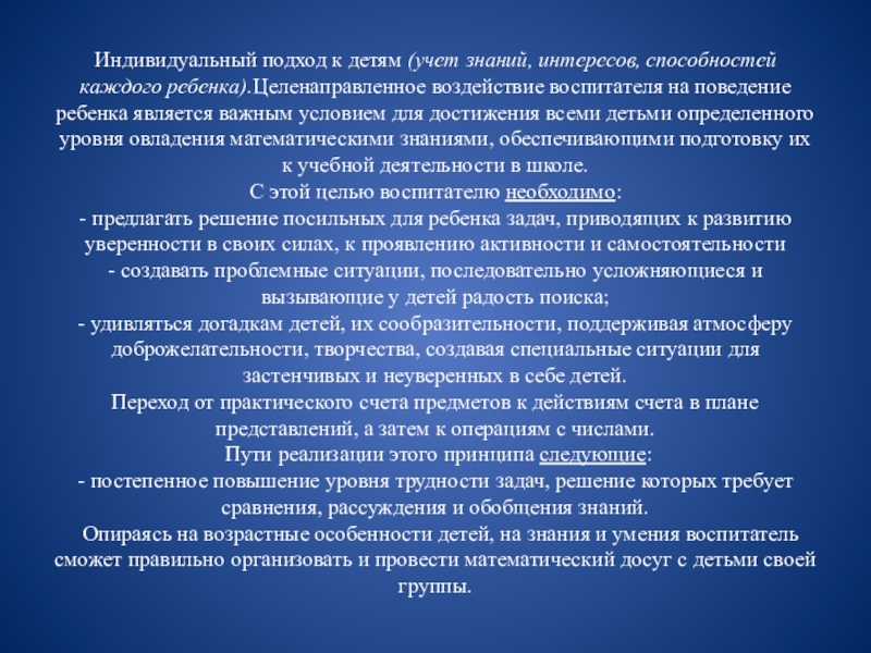 Слайд 10Индивидуальный подход к детям (учет знаний, интересов, способностей каждого ребенка).Целенаправленное воздействие воспитателя