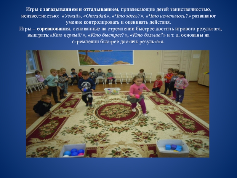 Игры – соревнования, основанные на стремлении быстрее достичь игрового результата, выиграть:«Кто первый?», «Кто быстрее?», «Кто больше?» и т. д. основаны на стремлении быстрее достичь результата.