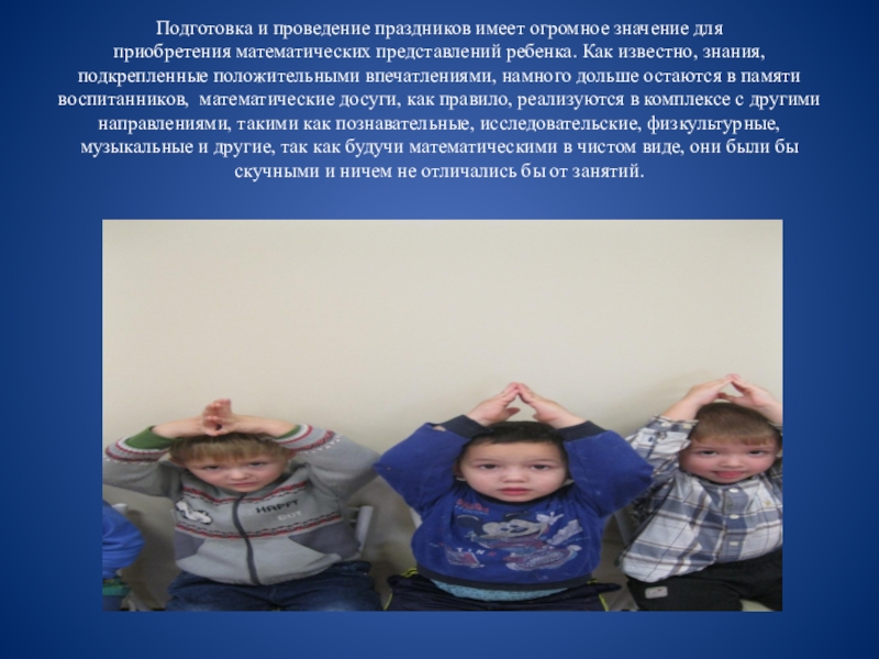 Слайд 8Подготовка и проведение праздников имеет огромное значение для приобретения математических представлений ребенка.