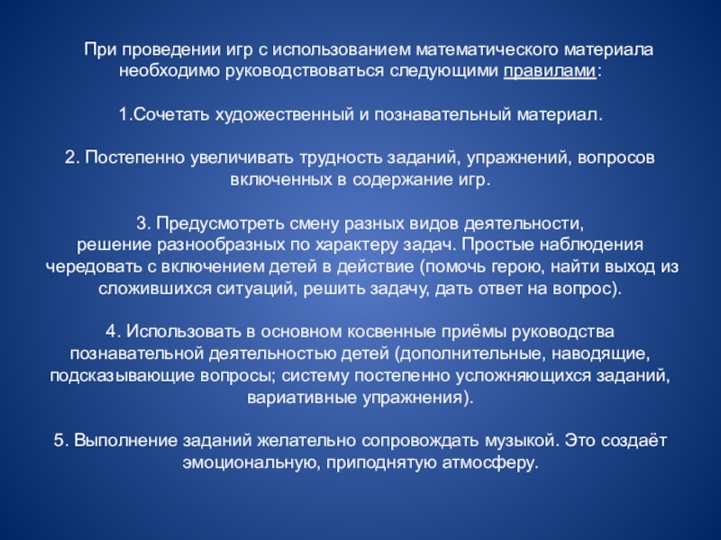 Слайд 6При проведении игр с использованием математического материала необходимо руководствоваться следующими правилами: