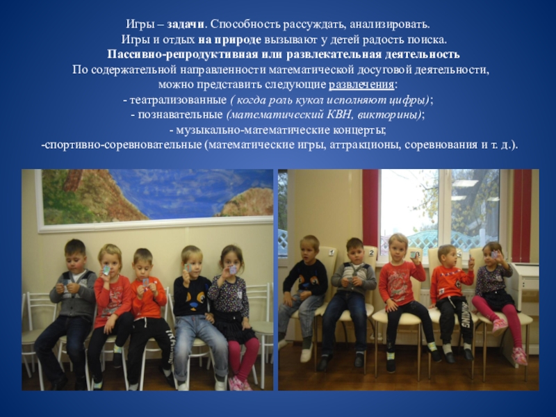 По содержательной направленности математической досуговой деятельности, можно представить следующие развлечения: