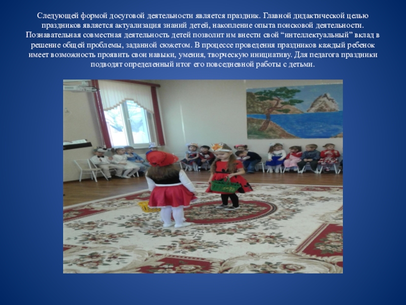 Слайд 7Следующей формой досуговой деятельности является праздник. Главной дидактической целью праздников является актуализация