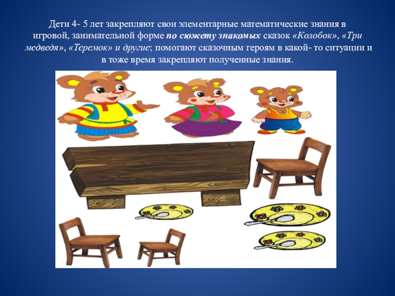 Слайд 3Дети 4- 5 лет закрепляют свои элементарные математические знания в игровой, занимательной форме