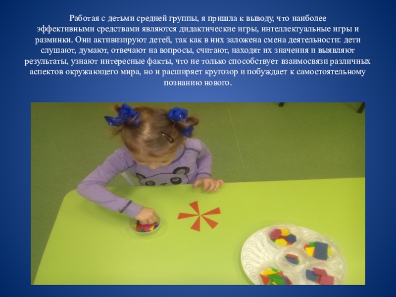 Слайд 11Работая с детьми средней группы, я пришла к выводу, что наиболее эффективными средствами являются
