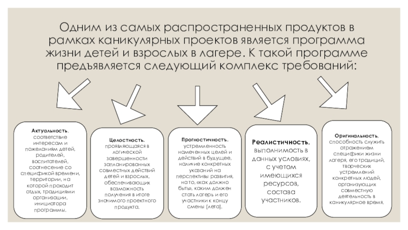 Оригинальность, способность служить отражением специфики жизни лагеря, его традиций, творческих устремлений конкретных людей, организующих совместную деятельность в каникулярное время.