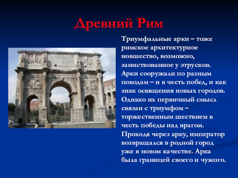 Триумфальные арки – тоже римское архитектурное новшество, возможно, заимствованное у