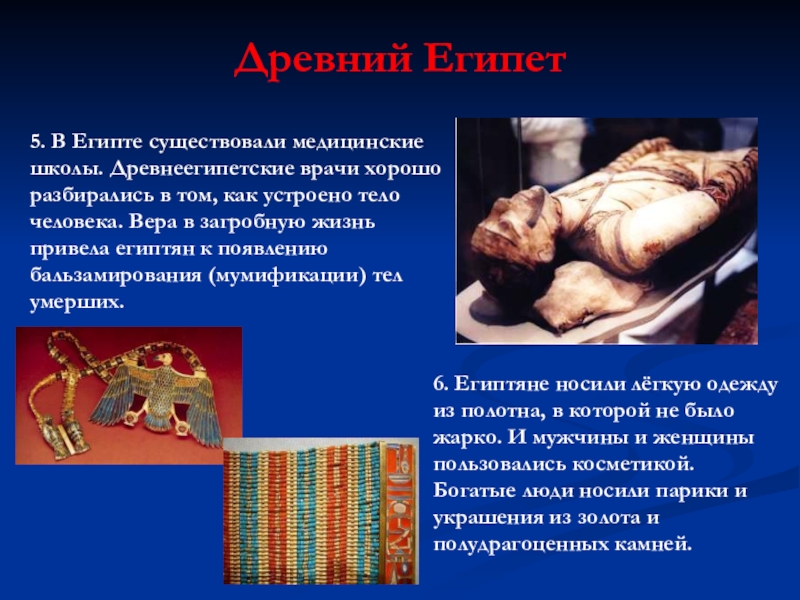 6. Египтяне носили лёгкую одежду из полотна, в которой не было жарко. И мужчины и женщины пользовались косметикой. Богатые люди носили парики и украшения из золота и полудрагоценных камней.