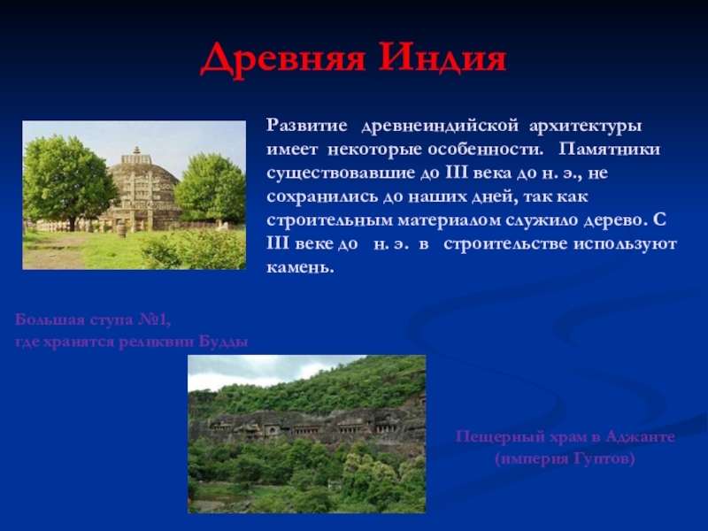 Слайд 18Развитие древнеиндийской архитектуры имеет некоторые особенности. Памятники существовавшие