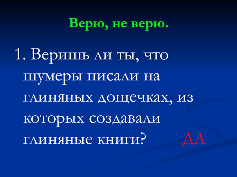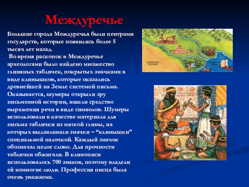 Во время раскопок в Междуречье археологами было найдено множество глиняных табличек, покрытых значками в виде клинышков, которые оказались древнейшей на Земле системой письма. Оказывается, шумеры открыли эру письменной истории, нашли средство выражения речи в виде символов. Шумеры использовали в качестве материала для письма таблички из мягкой глины, на которых выдавливали значки – “клинышки” специальной палочкой. Каждый значок обозначал целое слово. Для прочности таблички обжигали. В клинописи использовалось 700 знаков, поэтому владели ей немногие люди. Профессия писца была очень уважаема.