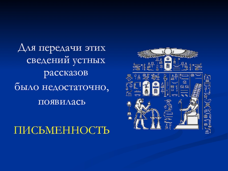 нашли более пригодный материал для письма, чем глина – папирус. Это тростник, который в изобилии растёт по берегам реки Нил. Они писали похожими на рисунки знаками, которые называются иероглифами. Их египтяне называли «божественная речь». Они придавали письменам важное религиозное и магическое значение.
