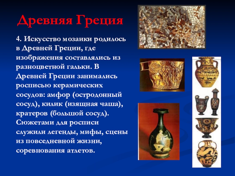 из разноцветной гальки. В Древней Греции занимались росписью керамических сосудов: амфор (остродонный сосуд), килик (изящная чаша), кратеров (большой сосуд). Сюжетами для росписи служили легенды, мифы, сцены из повседневной жизни, соревнования атлетов.