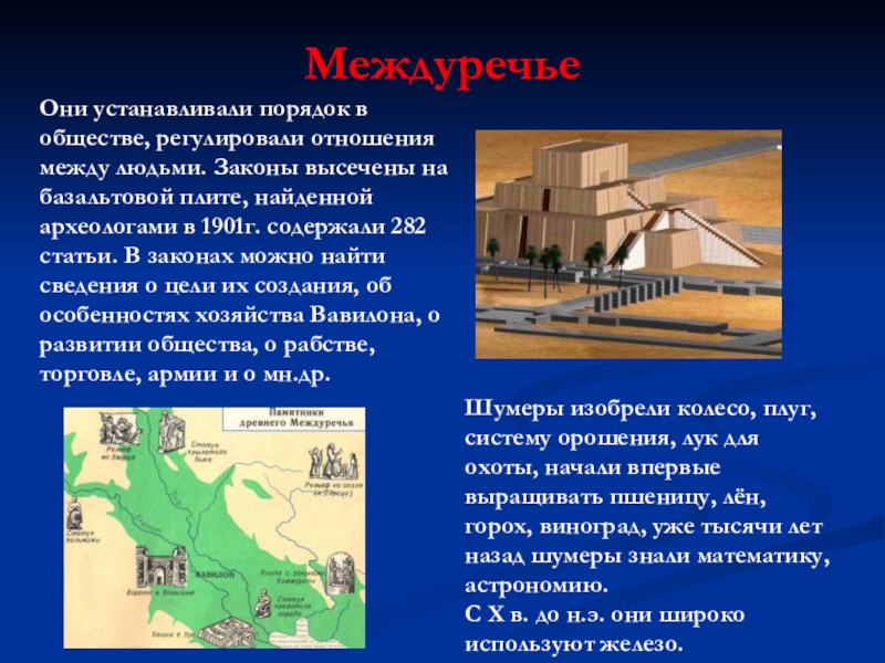 Шумеры изобрели колесо, плуг, систему орошения, лук для охоты, начали впервые выращивать пшеницу, лён, горох, виноград, уже тысячи лет назад шумеры знали математику, астрономию.