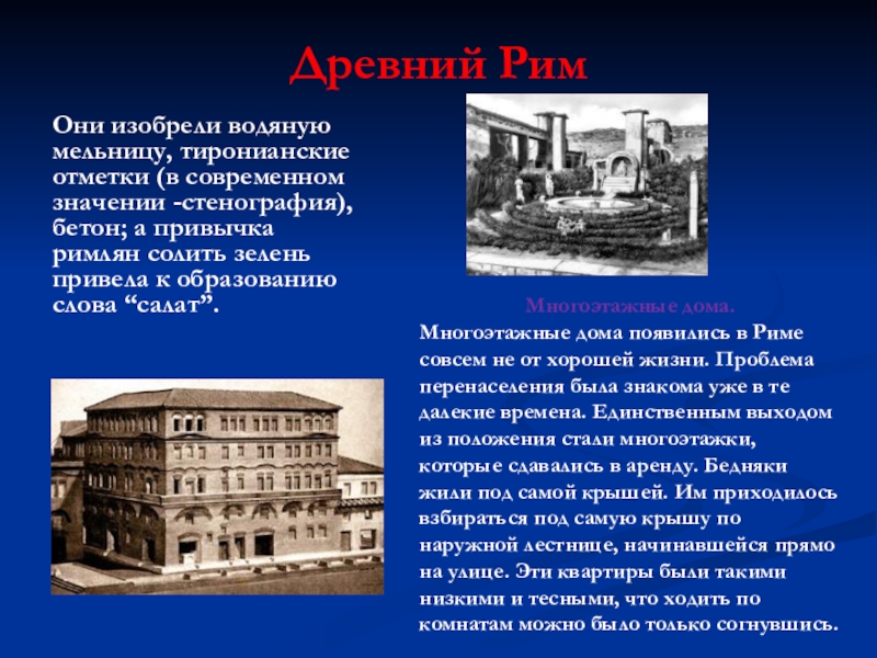 Многоэтажные дома появились в Риме совсем не от хорошей жизни. Проблема перенаселения была знакома уже в те далекие времена. Единственным выходом из положения стали многоэтажки, которые сдавались в аренду. Бедняки жили под самой крышей. Им приходилось взбираться под самую крышу по наружной лестнице, начинавшейся прямо на улице. Эти квартиры были такими низкими и тесными, что ходить по комнатам можно было только согнувшись.