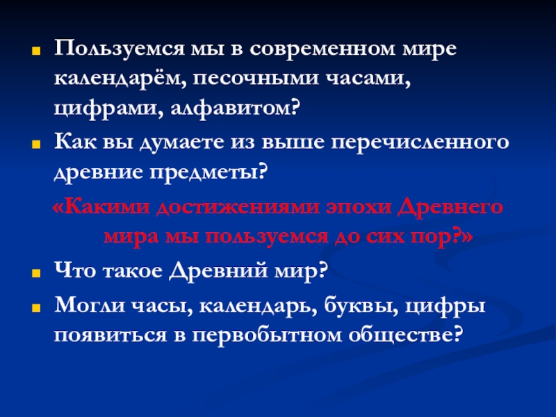 Слайд 2Пользуемся мы в современном мире календарём, песочными часами, цифрами, алфавитом?