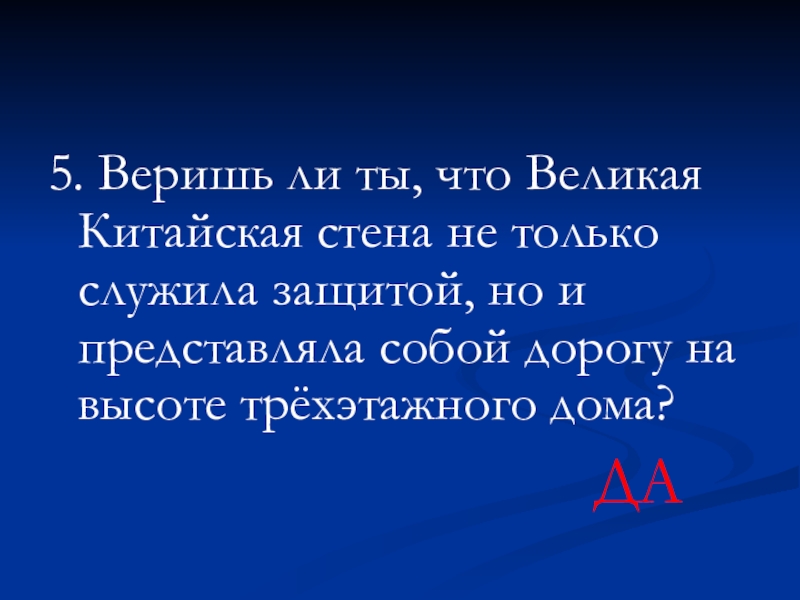 Слайд 345. Веришь ли ты, что Великая Китайская стена не только служила