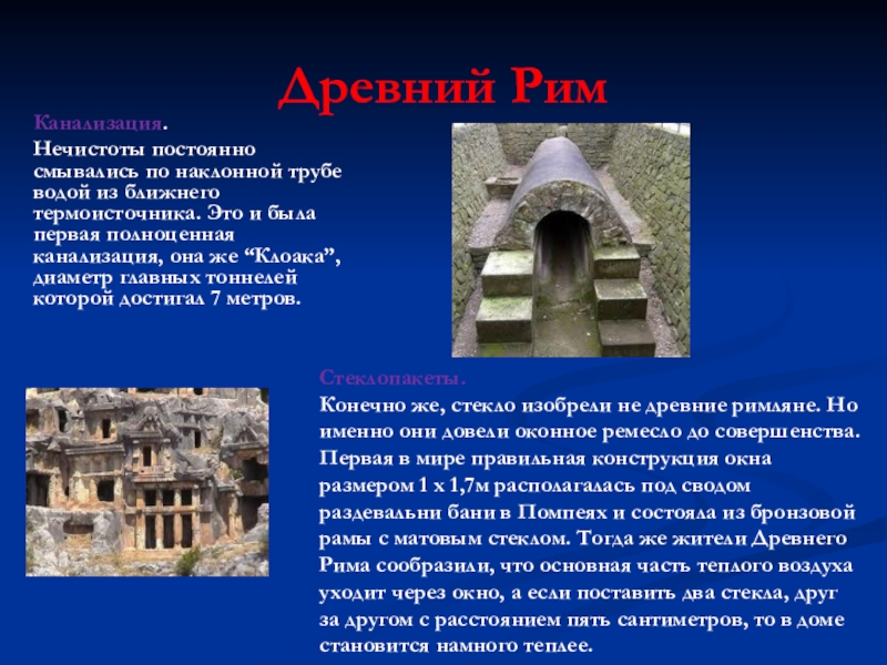 Конечно же, стекло изобрели не древние римляне. Но именно они довели оконное ремесло до совершенства. Первая в мире правильная конструкция окна размером 1 х 1,7м располагалась под сводом раздевальни бани в Помпеях и состояла из бронзовой рамы с матовым стеклом. Тогда же жители Древнего Рима сообразили, что основная часть теплого воздуха уходит через окно, а если поставить два стекла, друг за другом с расстоянием пять сантиметров, то в доме становится намного теплее.