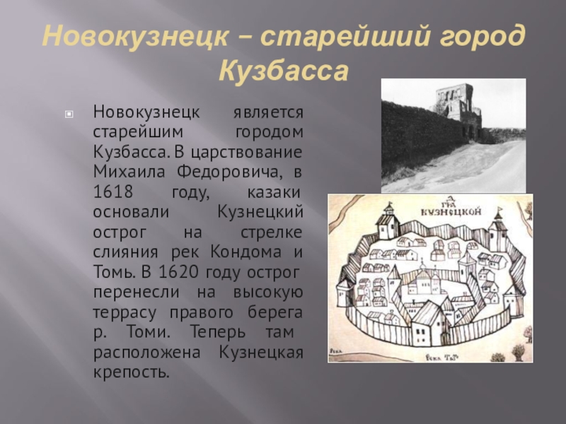 Новокузнецк – старейший город КузбассаНовокузнецк является старейшим городом Кузбасса. В царствование Михаила Федоровича, в 1618 году, казаки