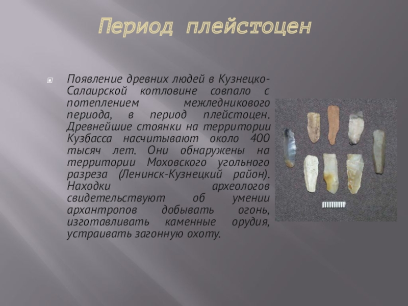 потеплением межледникового периода, в период плейстоцен. Древнейшие стоянки на территории Кузбасса насчитывают около 400 тысяч лет. Они обнаружены на территории Моховского угольного разреза (Ленинск-Кузнецкий район). Находки археологов свидетельствуют об умении архантропов добывать огонь, изготавливать каменные орудия, устраивать загонную охоту.