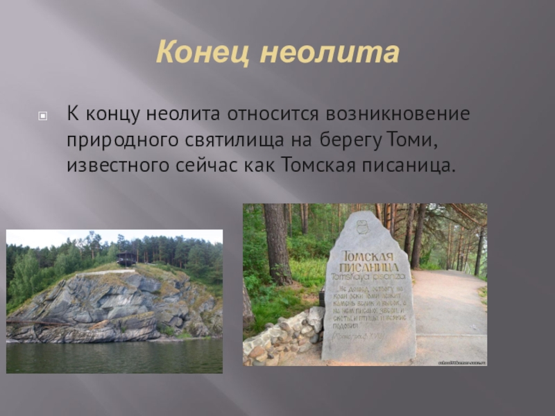 Конец неолитаК концу неолита относится возникновение природного святилища на берегу Томи, известного сейчас как Томская писаница.