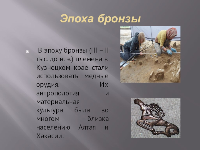 Эпоха бронзы В эпоху бронзы (III – II тыс. до н. э.) племена в Кузнецком крае стали