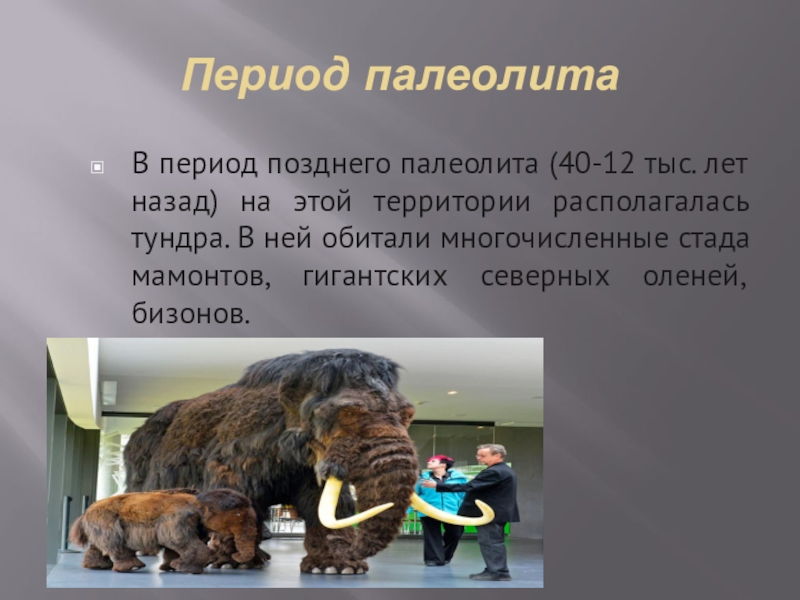 Период палеолитаВ период позднего палеолита (40-12 тыс. лет назад) на этой территории располагалась тундра. В ней обитали