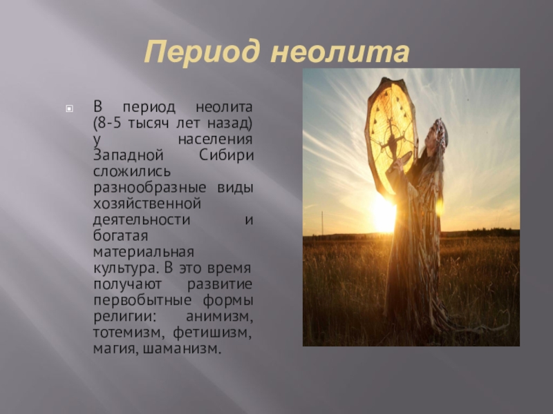 Период неолитаВ период неолита (8-5 тысяч лет назад) у населения Западной Сибири сложились разнообразные виды хозяйственной деятельности