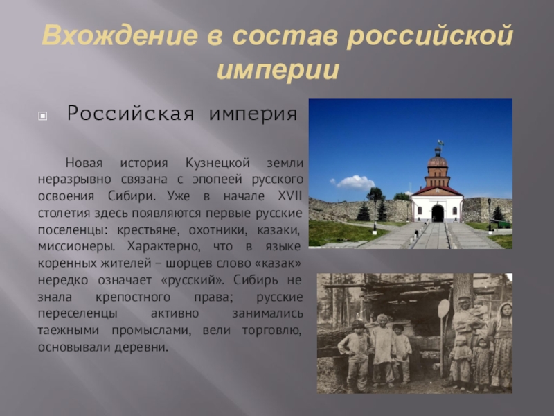 с эпопеей русского освоения Сибири. Уже в начале XVII столетия здесь появляются первые русские поселенцы: крестьяне, охотники, казаки, миссионеры. Характерно, что в языке коренных жителей – шорцев слово «казак» нередко означает «русский». Сибирь не знала крепостного права; русские переселенцы активно занимались таежными промыслами, вели торговлю, основывали деревни.