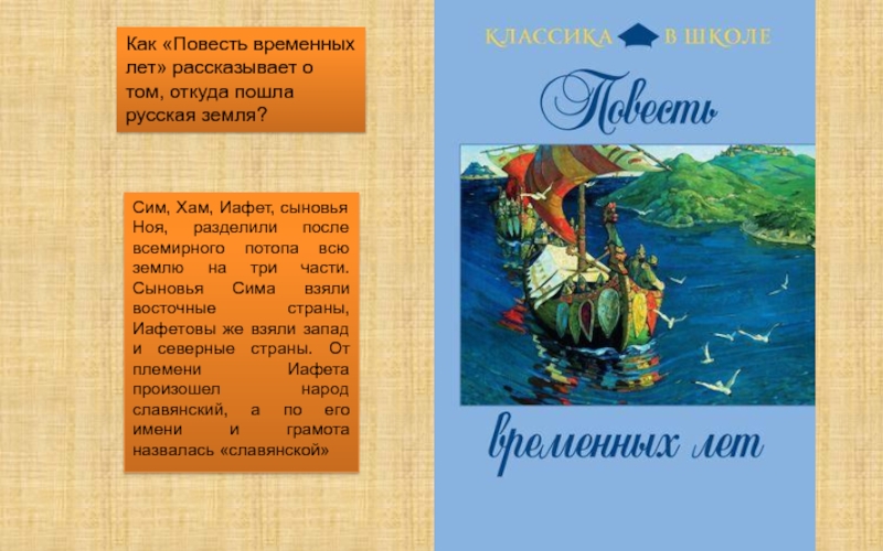 Сим, Хам, Иафет, сыновья Ноя, разделили после всемирного потопа всю землю на три части. Сыновья Сима взяли восточные страны, Иафетовы же взяли запад и северные страны. От племени Иафета произошел народ славянский, а по его имени и грамота назвалась «славянской»