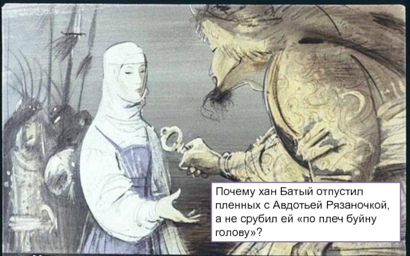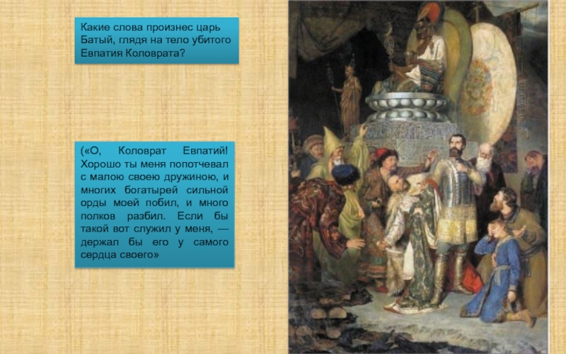 («О, Коловрат Евпатий! Хорошо ты меня попотчевал с малою своею дружиною, и многих богатырей сильной орды моей побил, и много полков разбил. Если бы такой вот служил у меня, — держал бы его у самого сердца своего»