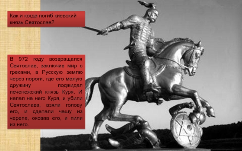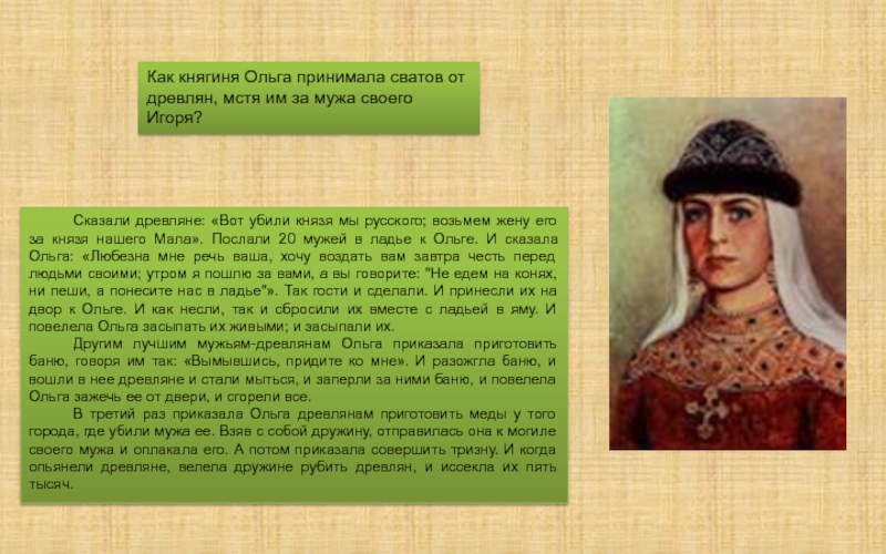 В третий раз приказала Ольга древлянам приготовить меды у того города, где убили мужа ее. Взяв с собой дружину, отправилась она к могиле своего мужа и оплакала его. А потом приказала совершить тризну. И когда опьянели древляне, велела дружине рубить древлян, и иссекла их пять тысяч.