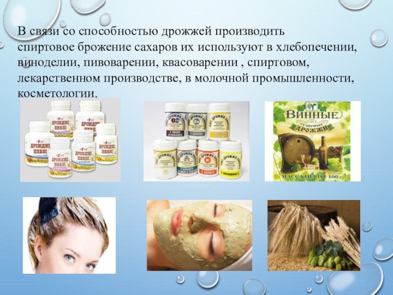 Слайд 8В связи со способностью дрожжей производить спиртовое брожение сахаров их используют в хлебопечении,