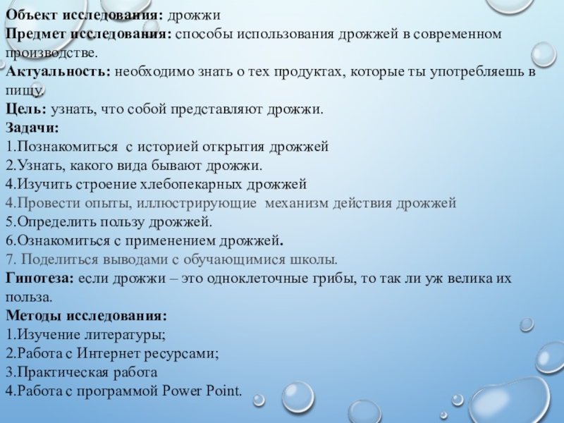 Предмет исследования: способы использования дрожжей в современном производстве.