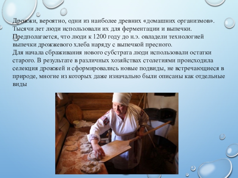 использовали их для ферментации и выпечки. Предполагается, что люди к 1200 году до н.э. овладели технологией выпечки дрожжевого хлеба наряду с выпечкой пресного.