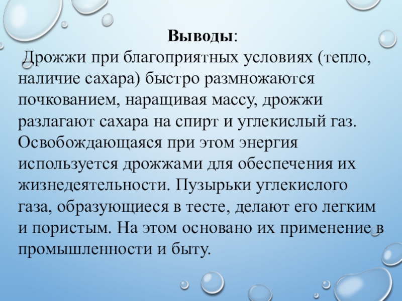 наращивая массу, дрожжи разлагают сахара на спирт и углекислый газ. Освобождающаяся при этом энергия используется дрожжами для обеспечения их жизнедеятельности. Пузырьки углекислого газа, образующиеся в тесте, делают его легким и пористым. На этом основано их применение в промышленности и быту.