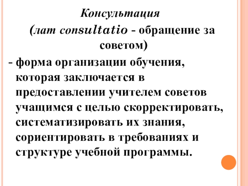 заключается в предоставлении учителем советов учащимся с целью скорректировать, систематизировать их знания, сориентировать в требованиях и структуре учебной программы.
