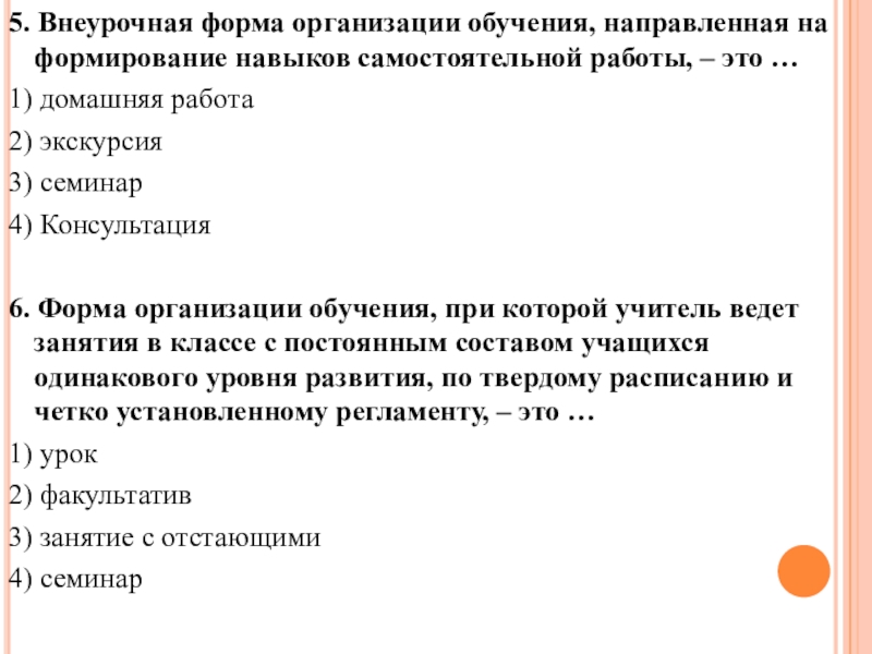 4. Форма организации обучения, используемая для отработки практических умений и навыков, - это