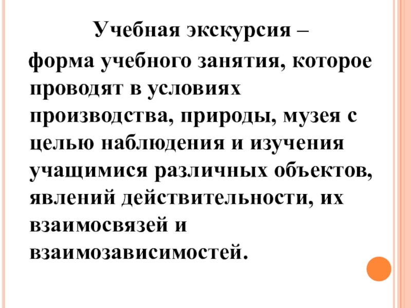 производства, природы, музея с целью наблюдения и изучения учащимися различных объектов, явлений действительности, их взаимосвязей и взаимозависимостей.