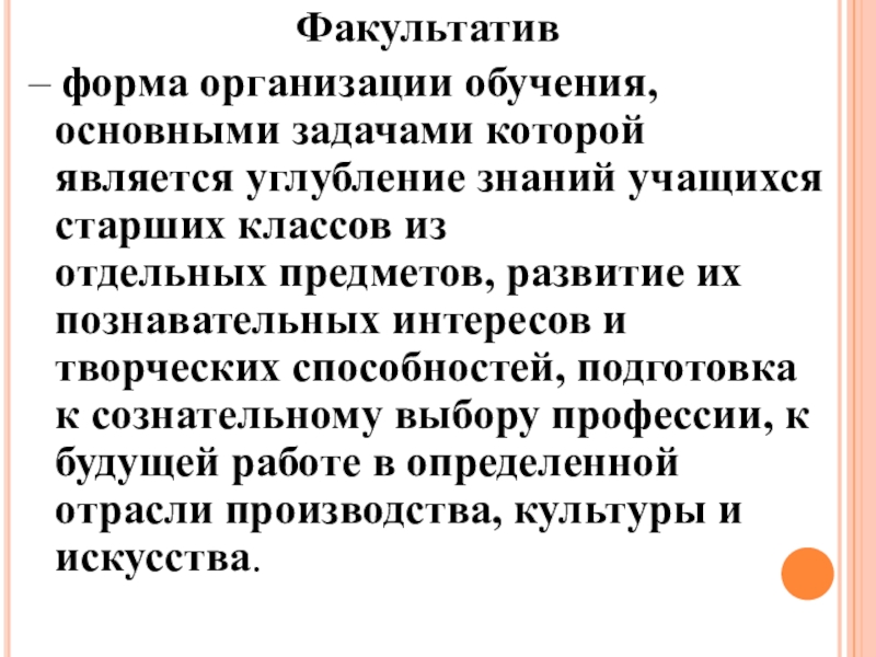 учащихся старших классов из отдельных предметов, развитие их познавательных интересов и творческих способностей, подготовка к сознательному выбору профессии, к будущей работе в определенной отрасли производства, культуры и искусства.