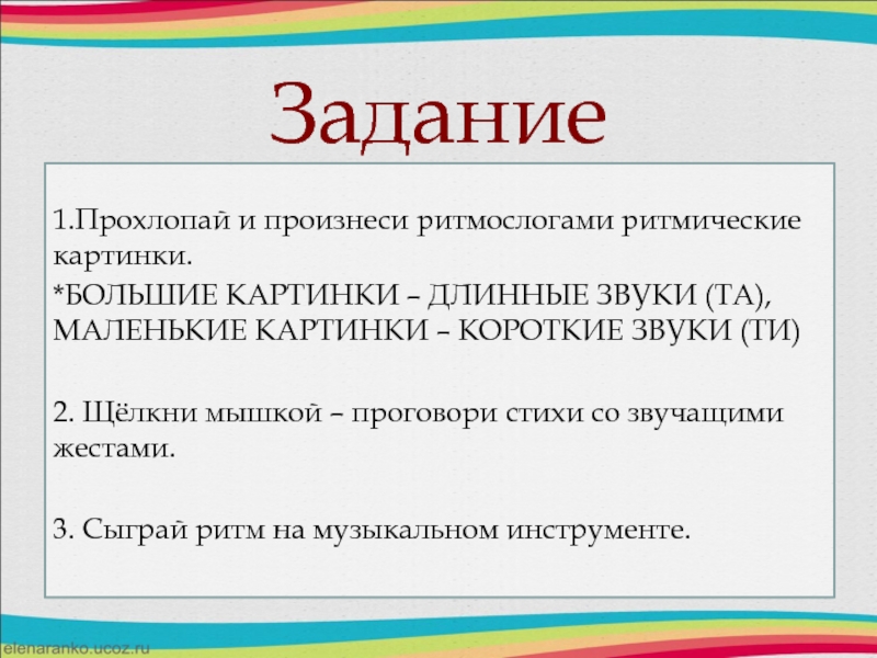 Задание1.Прохлопай и произнеси ритмослогами ритмические картинки. *БОЛЬШИЕ КАРТИНКИ – ДЛИННЫЕ ЗВУКИ (ТА), МАЛЕНЬКИЕ КАРТИНКИ – КОРОТКИЕ ЗВУКИ (ТИ)2. Щёлкни мышкой – проговори стихи со звучащими жестами.3. Сыграй ритм на музыкальном инструменте.