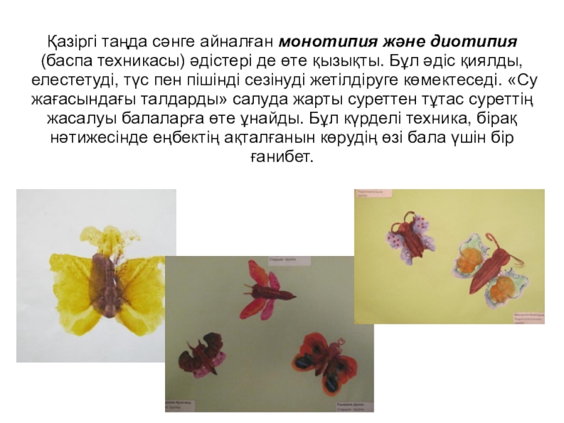 монотипия, ылғал бетте сурет салу, түрту, нүктемен, саусақпен т.б. дәстүрлі емес әдіс-тәсілдерді пайдалану ойлау қабілеттерін, қиялын шығармашылық қабілеттерін ұсақ қол моторикасын дамытады.